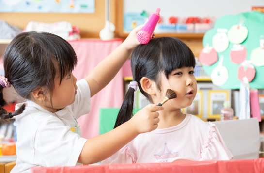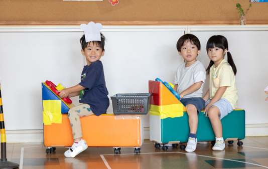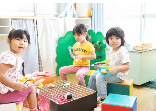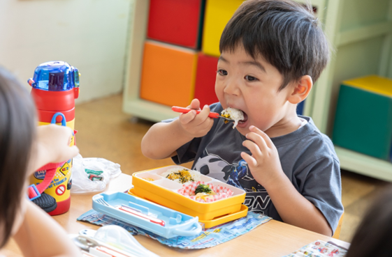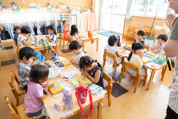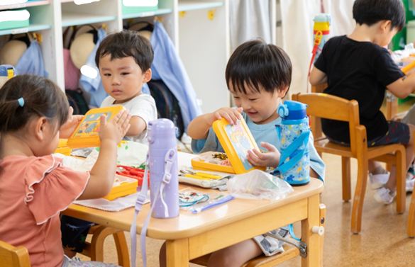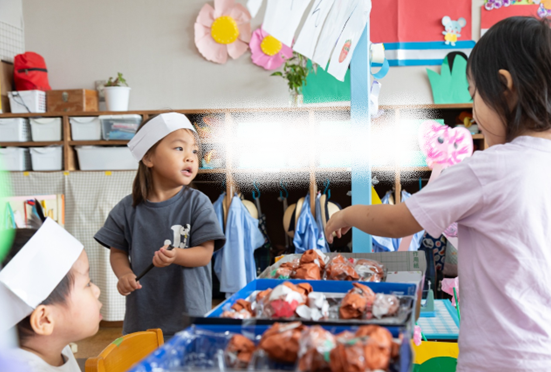 お友達と一緒にごっこ遊びやお店屋さんなど、やりたいことを見つけて楽しんでいる年少組さんです。同じことを一緒に楽しむ中で、友達との繋がりをより深めています。給食の日は、「今日は何が入ってるかな~?」とふたを開けるのがいつも楽しみです。みんなでいっしょに「いただきま~す!」