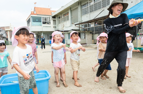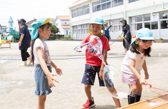 水鉄砲・フィンガーペイント・シャボン玉など水遊びをして解放感を味わいました。暑いときに水に触れると、本当に気持ちがいいね!