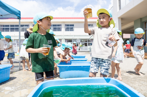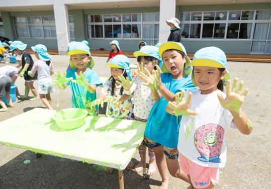 子どもたちが大好きな水遊び!ボディペインティングや色水作り、水鉄砲など楽しみました♪青空の下でダイナミックに遊ぶことができました。
