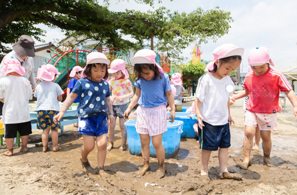夏の暑い日に木陰で水遊びを楽しみました。水風船やペットボトルシャワー、アヒルすくい…楽しかったね!水がかかってちょっとびっくりしたけれど、たくさんの水に触れて気持ちよかったね♪