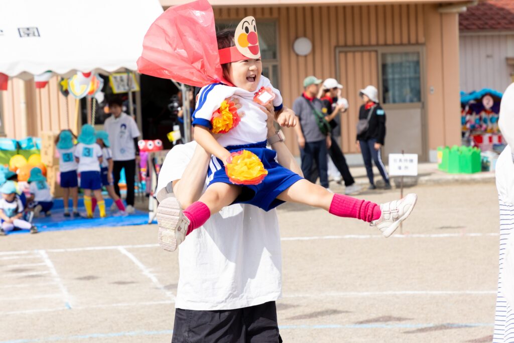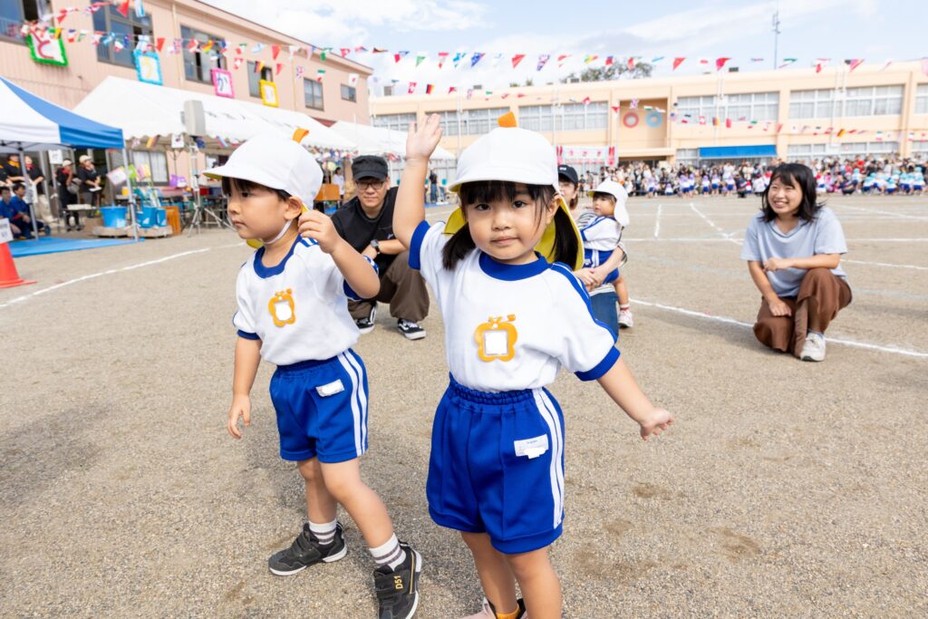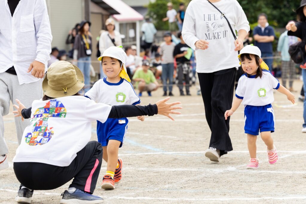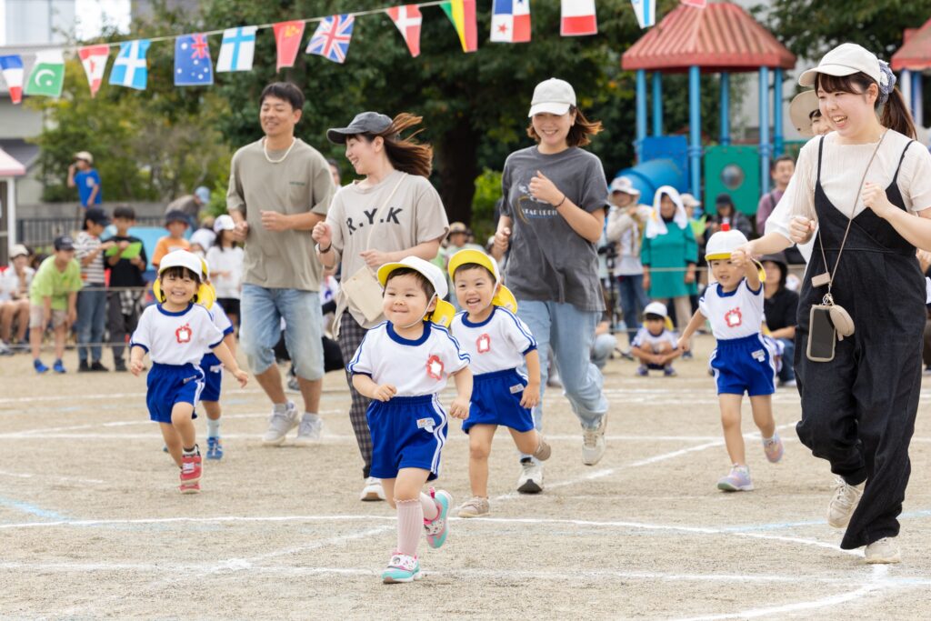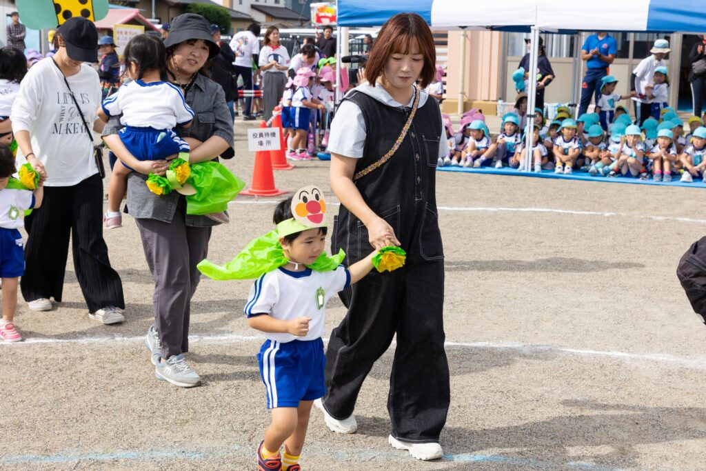 幼稚園に入園したばかりの満3歳児組さん。最初はドキドキしていましたが、お家の人と一緒に参加したので楽しそうでしたね。笑顔溢れる初めての運動会でした。